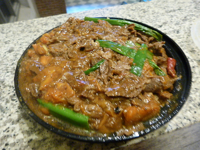The beef stew was delicious and I can imagine it would taste just as good over rice, or in noodle soup which are the other two options offered. There were chunks of meat that wasn’t too fatty along with sweet potato, some green onion, a couple of hot peppers (which didn’t make it hot) and a sweet spice that gave this a vaguely Asian flavor. Underneath there was a large pile of lo mein noodles and underneath that some raw cabbage. They are thoughtful enough to give you a plate with your take out order so it might be best to dump it out and mixed everything around.