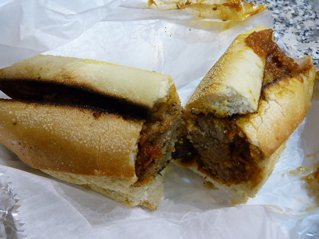 All of the hero sandwiches are $7 and although I didn’t notice this until after placing my order, you can add fresh mozzarella for 75 cents. It was freezing cold outside the day that I ate at the truck and for some reason that meant I must have the hero involving pork, veal and beef meatballs in Sunday gravy.