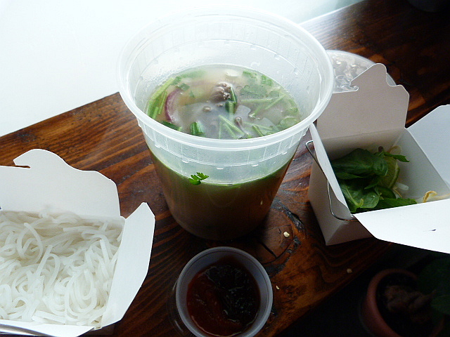 I’m not trying to be dramatic here: It’s not like you’re going to spit this pho out and go find something else to eat, but it’s not the best you’re going to find, even in the FiDi. The good news is they don’t skimp on the beef – there were at least six large slices that I dug out of the bottom of the container. The bad news is that even though it may have been rare at some point, it’s cooked to gray by the time you walk to your destination. Also, the rice noodles had congealed into a massive clump that was hard to dislodge from the paper takeout container they were in, but thankfully the blob turned back into separate strands once hitting the broth.