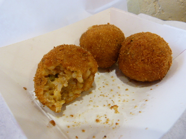 I restrained myself and instead order a couple of Sicilian rice balls ($1.20 apiece) containing beef and peas. They were freshly fried and tasty enough, but really I would recommend just getting a couple of slices instead.