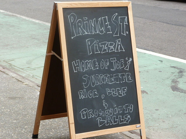 If you were one of the people who got sad when the original Ray’s Pizza (no, really) closed on Prince St. btw. Mott & Elizabeth never fear because the replacement is not too shabby. The straightforwardly-named Prince St. Pizza opened just last week and specializes in square slices and rice balls. An inquisitive neighbor peppered the counter guy with questions while I was in there and I learned that they’re not messing around with anything healthy like salad. The lightest option you’re going to find is a thin-crust slice.
