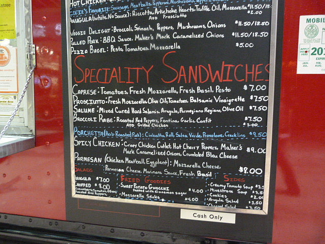 The Eddie’s Pizza Truck has been roaming the streets for a while serving its bar pies with toppings like pulled pork with Maker’s Mark carmelized onions. A while ago they added some sandwiches to the menu and after a mostly positive report on the porchetta variety from Blondie, I decided that someday when I was feeling indecisive come lunch time I’d go back for something that wasn’t pizza. That day happened earlier this week when it was rainy and disgusting and walking more than a few blocks for lunch was out of the question and it just so happened Eddie’s Pizza was parked on Water St.