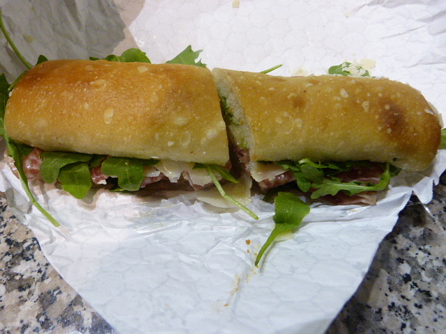 I ended up getting the salume sandwich ($7.50) which contained several slices of peppery salami, arugula, a pile of parmigiano reggiano and some olive oil on what I’m pretty sure was ciabbata. After a recent week of eating gutbomb sandwiches like this, it was nice to eat something a tad lighter evenif there were a lot of meats and cheese involved.
