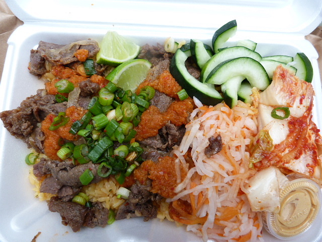 The meat was good in that sweet/savory way that bulgogi is – much better than the spicy chicken I’d gotten from this truck once before. Underneath everything there was a good amount of rice that was seasoned a little bit, and delightfully oily from the meat and kimchi. I would maybe recommend mixing the rice and everything together because on its own, the base layer was a little dull. Or you could pour on some of the sauce they include which tasted to me like a creamy honey mustard.