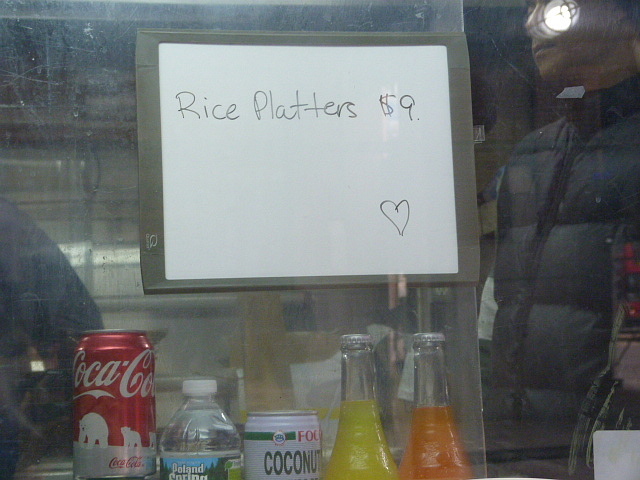 There was a sign of sorts advertising that they did indeed have the rice platter ($9) on board, so I ordered one with bulgogi. They don’t really tell you what exactly goes into this platter but I handed over my money and rolled with it, only asking for some hot sauce on the side because I’m always afraid food won’t be spicy enough.