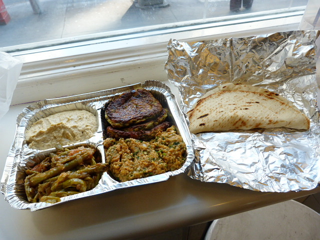 I ordered the muchver platter ($7.95) which you can get with either rice and two salads or three salads. I did the latter option because the rice didn’t look that awesome, but the buffet of Turkish salads behind the counter did. I chose hummus, red lentil salad (next to the zucchini patties above), and string beans. You also get a pita made in house.