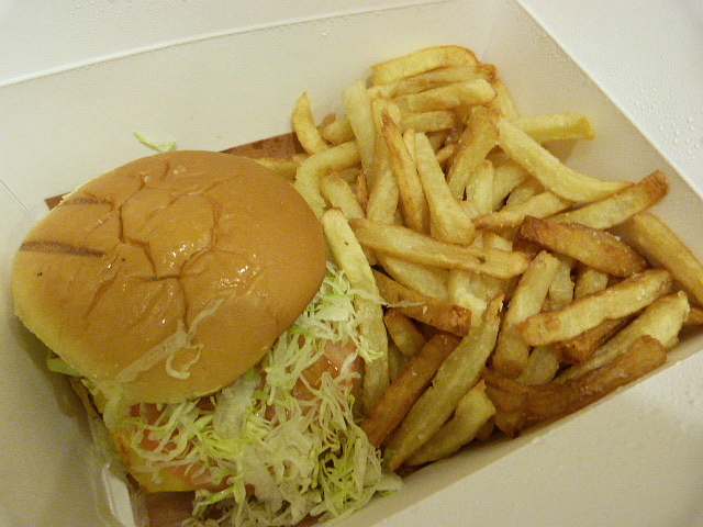 The good news was this was a decent burger, with a little bit of pink left in the middle. They automatically give you tomato, shredded iceberg lettuce, a sweetish sauce and American cheese. As far as I know, that’s the only cheese option there is. If you want mustard or ketchup you’re going to have to put it on yourself. The size of the burger was fine for me, especially given the large pile of fries I got with it. Heartier appetites are probably going to want to go with a double.