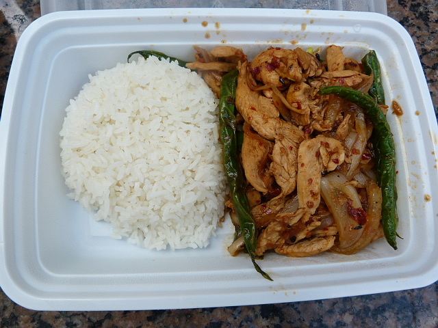 The lunch box offers pad thai, chicken curry or sate, green Thai curry over lo mein and a few other items that come with rice and spring roll. I ordered the spicy basil chicken box and walked over to pick it up.
