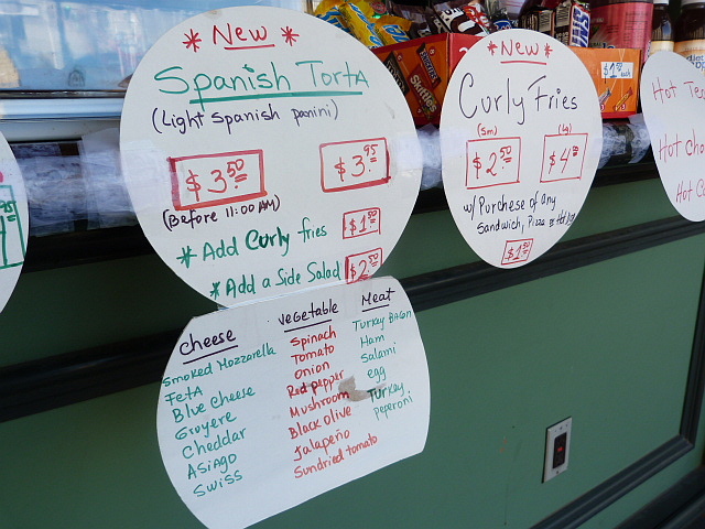 They basically let you design your own sandwich, picking vegetables, cheese and meat from the list of what they have on a given day. It’s best to ask the woman taking your order because it seems they don’t always have everything listed. I went with gruyere cheese, roasted red peppers and jalapeno. Then I waited a few minutes for my cheesy, carb-filled lunch that cost a little less than $6.