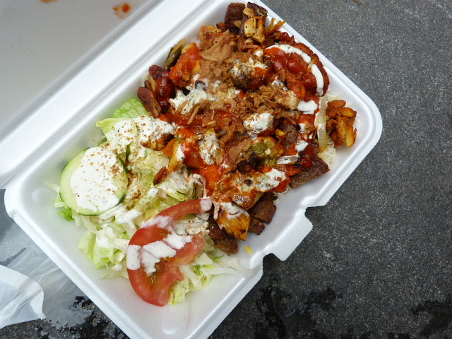 The sprinkling from the metal container was key, because it was crunchy fried onion and it took this plate of street meat to another level. The other thing that was great about this was the chicken. It was the same reddish, marinated kind used in the plate of chicken tikka and it was really moist. The lamb was nothing special – your usual chopped up gyro meat – although I will say it was nicely crisped on the griddle.