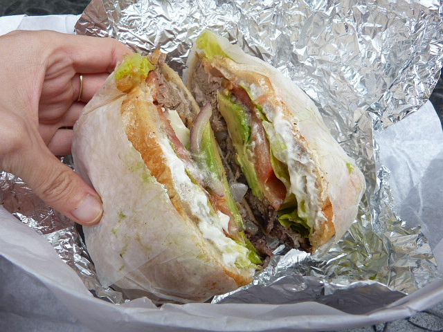 Since I’d already sampled the tacos, this time I went for a torta ($6.50) with the tortas borrachas filling which is “Puebla-style shredded pork” avocado, pico de gallo, Tecate beer (!) and jalapeno rajas. That’s a lot going on in one sandwich!