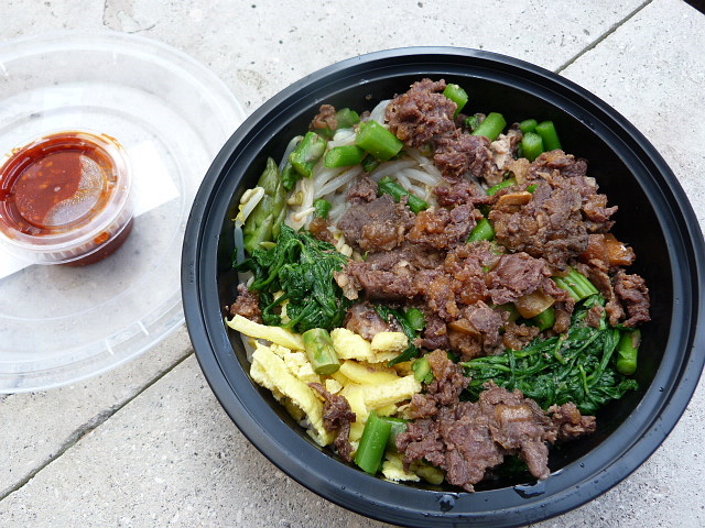 I got the beef bowl ($8.95) which contained a good amount of marinated beef, mushrooms, asparagus, sauteed spinach, marinated bean sprouts and a pile of cooked, chopped up egg. There was also a container of Korean g0-chu-jang sauce on the side which was the saving grace of this lunch.