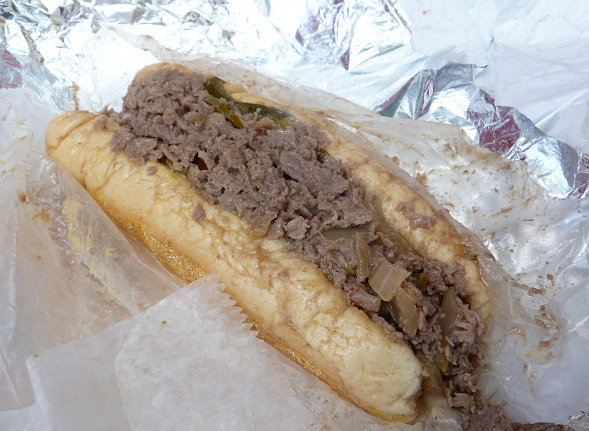 My first impression upon unwrapping my half cheese steak wit’ onions and whiz ($6) and the addition of hot peppers (75 cents) was of the amount of grease coating the top of the bread. I can call it nothing but a sheen. Clogged arteries be damned, I took an enthusiastic bite and actually found it tasty! I was happy I got the onions and peppers for some contrast with the soft meat/bread/whiz trifecta happening. Most of the whiz was on the bottom of the bun, so some bites were all meat, some more cheesy so I guess if you have a need for more dairy in your life you might want to pony up the extra 75 cents to get double.