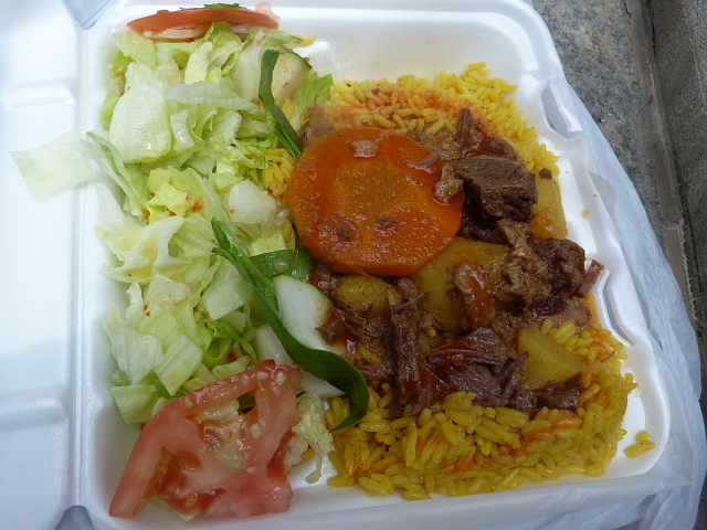 Their specialty seems to be chili dogs, judging from the pile of tube steaks on the griddle and prominent signs for them. I asked for the beef stew which is available on Tuesdays and Thursdays, according to the ladies inside. It’s served with yellow rice and salad with Italian dressing for a little bit of cross-cultural fun. A couple of scoops of the stew were ladled over the rice along with a spoonful of broth. This and a couple of squirts of hot sauce made the rice pretty awesome after I was done eating the tender chunks of beef and potato from the top. There was also a piece of what I think was yam or sweet potato.