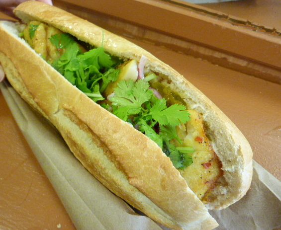 Amazingly, no one’s written about this sandwich on ML: Downtown. If you’ve never eaten it, the catfish variety ($7.50) involves a couple of substantial hunks of fish bathed in a honey mustard sauce, along with pickled red onion, cilantro, cucumber relish plus jalapeno if you so desire. The baguette is nicely crisped and ensures you’ll have a pile of bread shards on yourself and possibly honey mustard sauce dripping down your hand. Make sure and grab plenty of napkins and don’t eat this if you’re wearing white.