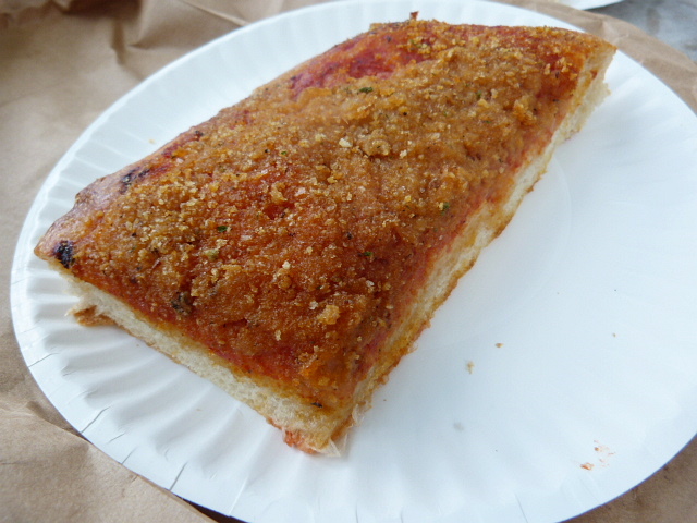 The Palermo at Ben’s is a sfincione slice that has been written about a million times, and is a delight. If you’re a vegetarian, steer clear because that brown topping involves chopped up anchovy along with bread crumbs, onion and some grated cheese (which I learned by reading this). I felt pretty guilty about my decision to order this slice AND a plain regular slice, but figured I needed to try both in the name of research. I’d have to say, though, that the square marinara slice also looked pretty tasty. The sfincione slice is pretty oily, but I would definitely eat this again.
