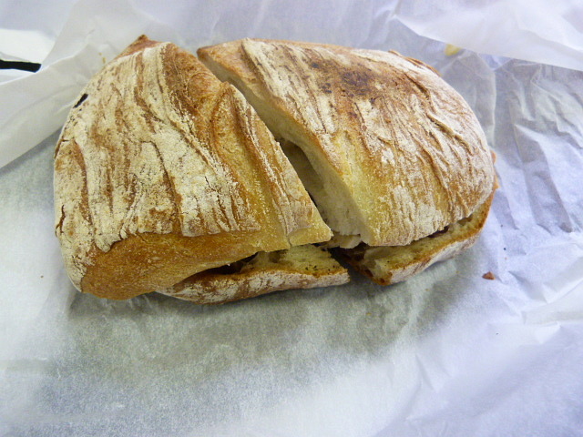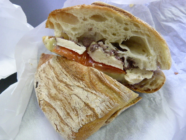 There aren’t a lot of options on the menu, but enough that vegetarians, meat eaters and those people in your office who always eat salad will all be happy. There’s a little salad bar in the back where you can get whatever toppings you want. I went the other direction and opted for a sandwich involving chicken, brie, tomato and olive tapenade on country bread ($7.50). I asked for the cold version, but it was placed on a panini press for a couple of minutes which turned out to be a fabulous idea because the bread got all crispy and delicious on the outside. My only other comment on the sandwich was that the chicken, which appeared to be sliced off a rotisserie bird, was excellent.