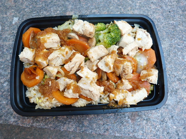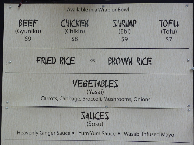 You can get beef, chicken, shrimp or tofu and vegetables over fried or brown rice or in a wrap, and three choices of sauce. There’s the choice of ginger, a wasabi mayo or “yum yum sauce” which I was told is also mayo-based with a Cajun seasoning. My combo was chicken over fried rice with ginger sauce ($8). You can get extra meat for $2, but I was fine with the regular portion so as to keep my girlish figure.