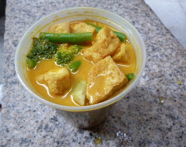 There are some dishes on the Lemon Leaves menu that you don’t normally see, like curry laksa and nasi goreng (OK, these are not really Thai, but still) and things like what I ordered – the chiang mai mee ($9), which you may also know as khao soi. It’s not exactly ideal for summer eating as it’s basically a curry noodle soup, but it was mighty fine. The curry is pretty spicy, so be warned, and there were plentiful chunks of fried tofu, broccoli stalks and green beans. There were a whole lot of thin egg noodles down at the bottom, too. It’s pretty messy to eat from a to-go container, but also really tasty. I appreciate that they didn’t dull down the flavors as seems to happen so often at restaurants in the Financial District.