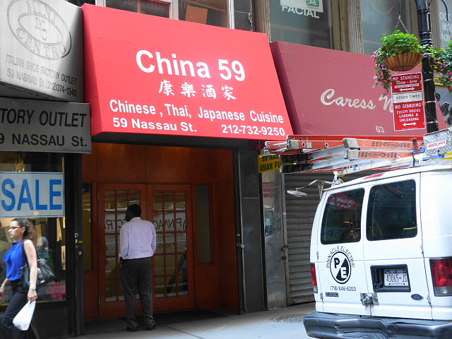 Yesterday I noticed a brand new awning for China 59 on what was more recently Hana on Nassau St. (btw. Maiden Lane & John). A look at the Chinese and Thai menus shows they haven’t really changed much except the name, and you can get all of the usual suspects in a lunch special for $8 or $9 which is at the higher end of what I consider an acceptable amount to pay for pad thai/sesame chicken/beef teriyaki. I’m always wary of places that serve more than one type of food, but I guess it’s one stop shopping for the indecisive eater.