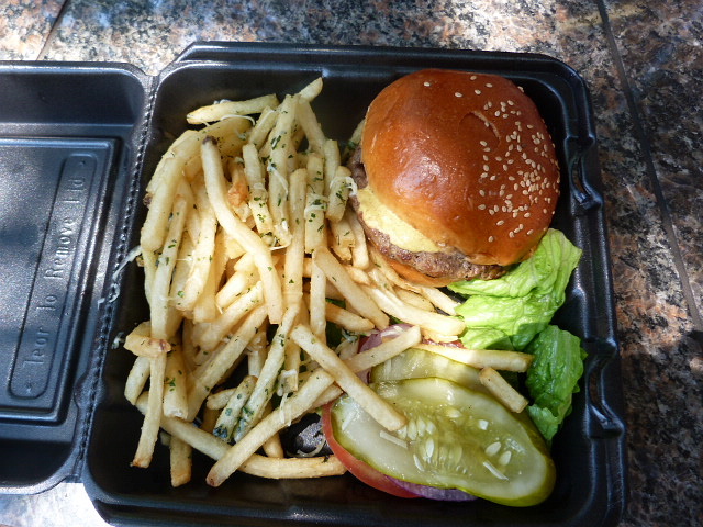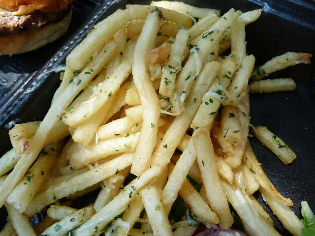 Regular fries are included with all of the burgers, but when asked if I wanted the garlic parmesan fries ($2 extra) I couldn’t resist. It was a Friday and fries with garlic and cheese sounded pretty great. On their own these fries would be good, but the slivers of slightly melted parmesan and roasted garlic that flavored these made them so much better. If you don’t like garlic, you’re probably not going to like these – as I was walking back to my office I could smell the fries through the takeout container and a plastic bag.