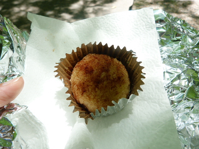 I also couldn’t resist getting one of the baked goods which are $1 or $2 and include baklava, coconut cake, carrot cake, cheese and spinach pies and halva. It was the last one that I had my eye on. The woman asked if I’d ever had it before, and after I said no she told me it was made of semolina and sugar with cinnamon on top. It’s a dense little cake, and it was delicious.