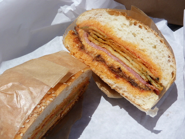 Previously, I’d sampled the vastedda, aka beef tongue, and the namesake pane panelle sandwich which was chickpea fritters and cheese. They were OK, but the prices were a bit high for what I got, I thought. This time I opted for the melanzane e panelle ($9) with fried eggplant, chickpea fritters, mortadella and pecorino.