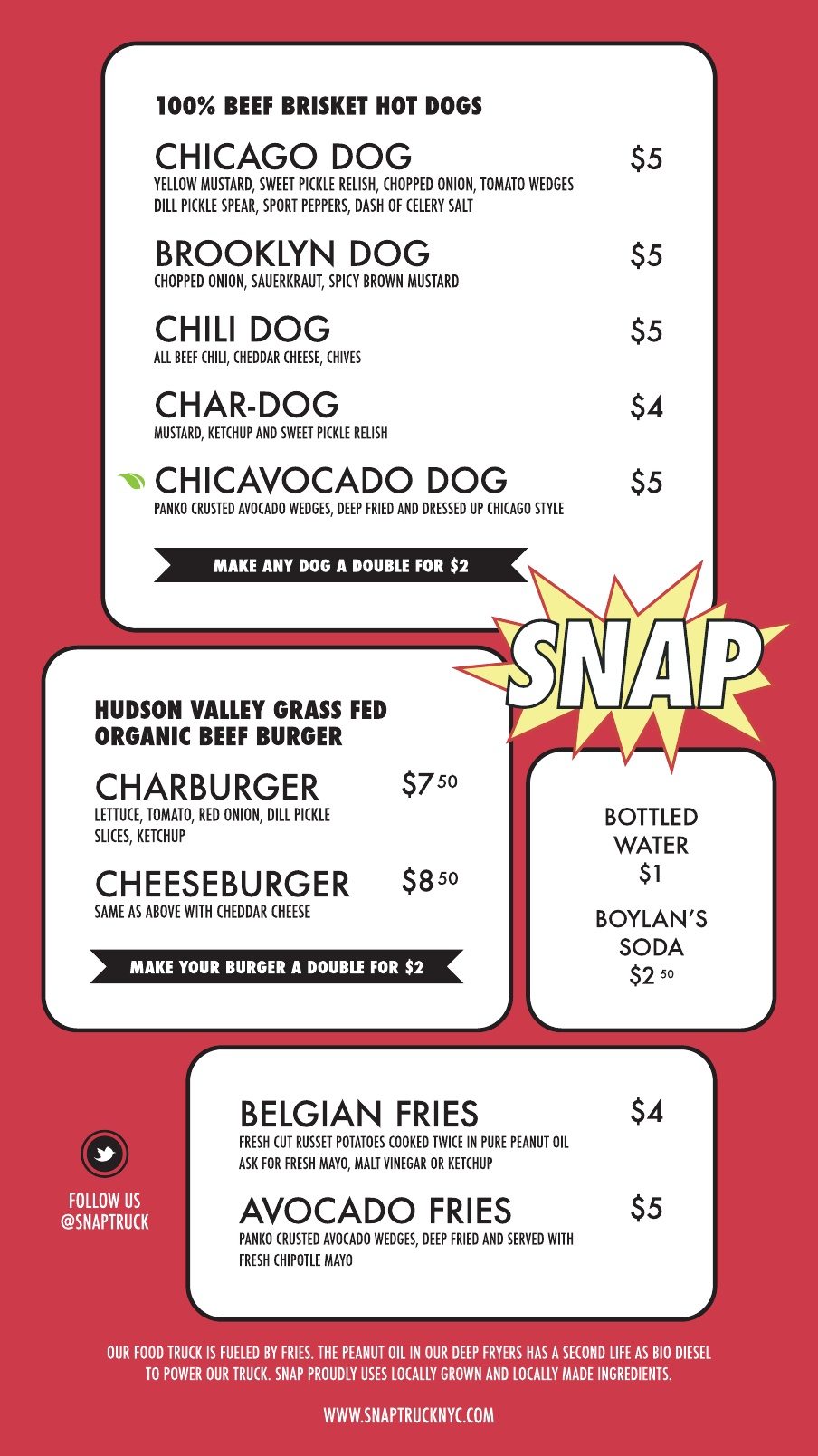 The Snap Truck has been on our radar for a while as they raised money and converted their truck into one that runs on recycled cooking oil. Well, after officially hitting the streets at a weekend food truck rally, they’re going to be at the Lent Space every Wednesday starting today. The menu is pretty simple and is focused on various hot dogs including a Chicago-style one and a vegetarian version with the same toppings, but instead of a hot dog you get fried avocado! The burgers and hot dogs are charcoal-grilled, and they use the leftover oil from their two kinds of fries to power the truck. You can take a peek at the bio-fuel menu after the jump.
