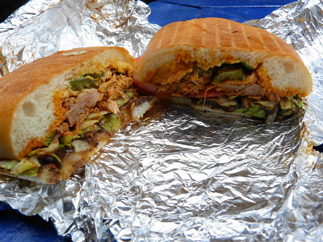 At some point Cafe Habana won an award for its Cubano sandwich (according to the menu), but it was the item listed below that on the wall that caught my eye – the “Sloppy Jose” BBQ pulled pork sandwich ($7.50). I’m a sucker for anything fusing BBQ and pork, and as you can see they give you a lot of it in the form of a torta although you could also get it in a burrito. I also heard a lot of people in front of me ordering the chicken diablo sandwich.