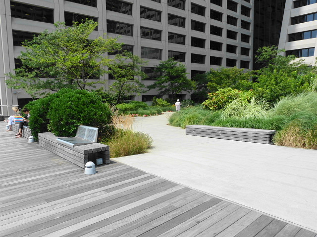 The park is located behind 55 Water St., just past Old Slip. Look for the escalators and set of stairs next to the Chase branch, and then you’ll see a small brass sign noting that Elevated Acre exists, which you would never notice if you weren’t looking for it. After taking two escalators up you’ll be met with a bunch of greenery and so many open benches and tables that make it seem like you’re in a botanic garden instead of slogging through a work day in Lower Manhattan.