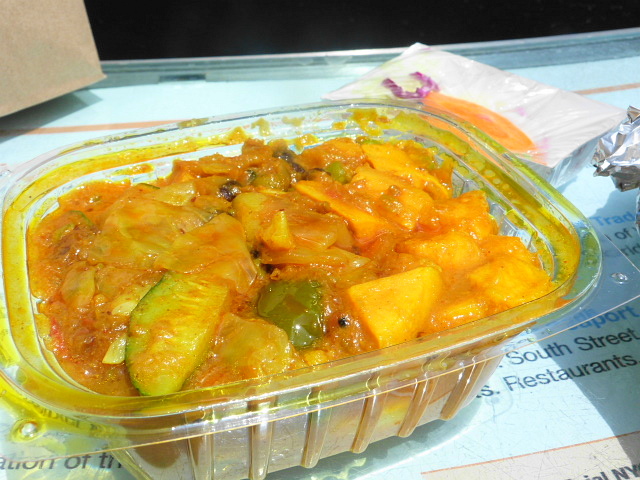 I really liked all of the dishes I got, but the chicken korma stood out. There were all kinds of herbs going on in there and because of the sauce/steam table they weren’t dry at all. The spicy vegetables involved mostly cabbage, bell peppers and zucchini and did indeed pack some heat.The sweet potatoes were good too although the flavor kind of blended together with everything else since it was all in the same container.