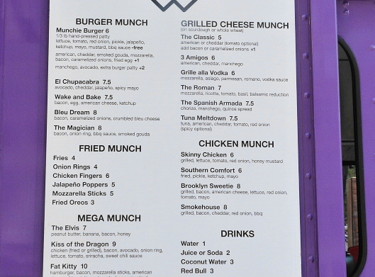 There are trucks out there serving crazy sandwiches and burgers – the Feed Your Hole truck instantly comes to mind – but they don’t often come downtown during lunch hours. Munchie Mobile hit the streets a while back but it wasn’t until late last week that I was able to catch up with the truck during a stop at the Lent Space food truck lot at 6th Ave. between Canal & Grand. I’d looked over the menu before getting there and it’s pretty vast with several variations of burgers, grilled cheese, chicken sandwiches, fried items and some other combos thrown between bread that breached the $10 mark without including a side. I mean, if you’re eating a triple decker grilled cheese involving a hamburger patty, jalapeno poppers and fries (that would be the Gangsta’s Paradise for $11) you’re not going to be needing some onion rings on the side.