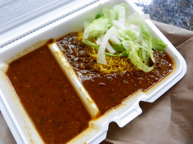 The truck now has a little sign up listing prices and carb options which is $4.75 for a small, $6 for a large and $7 for anything involving lamb. You get basmati or biryani rice, or naan or roti with your meal and the option of a little bit of salad which involves lettuce, raw onion and a couple of chunks of cucumber.