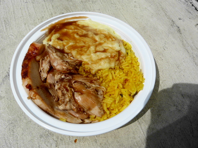There are lot of different beige, brown and yellow foods happening in the above container, but the contents would be a turkey dinner that only cost $6. The turkey is cut straight from a bird and I got a mix of dark and white meat, just as I would at someone’s house. You get to choose two sides and the options are heavy on the carbs (or at least they were the day I was there) and included macaroni & cheese, spinach with what looked like a thick blanket of cheese baked on top, mashed potatoes and yellow rice. I went with the latter two, with some mushroom gravy poured over all of it.
