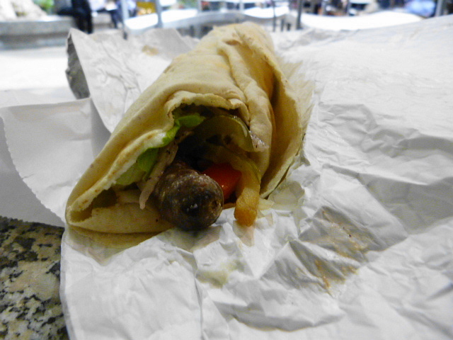 I went with the makanek simply because I’d never heard of it before and it sounded good. Also, it was pouring out and intensely pondering the menu wasn’t going to happen. Inside the sandwich was iceberg lettuce, tomato, pickle spears, onions, french fries and five or six of the beef sausages that were the size of a long chubby finger.