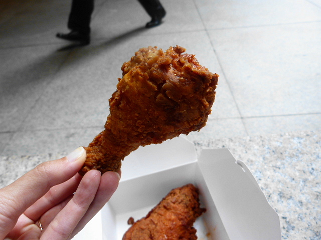 There was a leg and a breast in the box and holy crap was that a huge piece of chicken! Seriously, I could have made two meals out of this since the cornbread was really dense and rich – more like baked polenta than a bread. Also, props to the cooks who made me happy I waited for the fried chicken to be done. I actually liked the juicy white meat chicken more than the dark meat although the breading on each was well-salted and still crispy even after a 15 minute walk back to my office. They also give you a little cup of a vinegar sauce with jalapeno which I dipped pieces of the chicken in. So good!