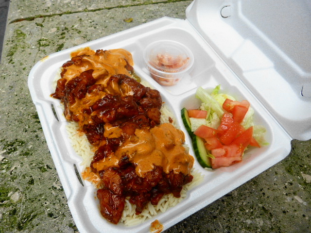 Back in May after the Bob & Jo Truck started parking in the Financial District one day a week, I had a bulgogi sandwich that had a lot going for it, but was marred by too-chewy baguette. I haven’t been back because there are about a million other trucks hitting the area these days that consistently serve delicious food. On Tuesday (when the truck parks on Hanover Sq.), although the siren song of the many taco trucks crowding the lower FiDi was strong, I instead headed to Bob & Jo where a line of people was ordering rice plate after rice plate. Perhaps trying a baguette sandwich at a Korean food truck had been too risky a venture and the meat over rice was where it was at.
