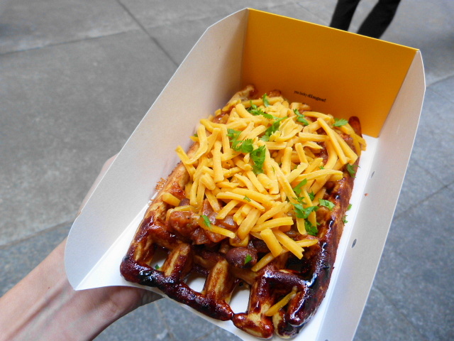 Last week’s cooler weather brought out the sweaters and also a lot of hearty seasonal specials at trucks and other lunch spots. Wafels & Dinges took the opportunity to add to its savory side with the winter addition of the corn waffle with either meat or vegetable chili along with some toppings. But would this $7 concoction be more of a lunch than one of their regular sweet waffle concoctions?