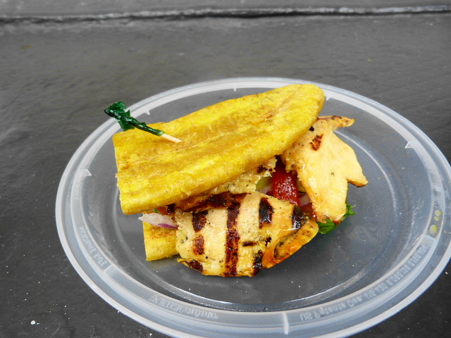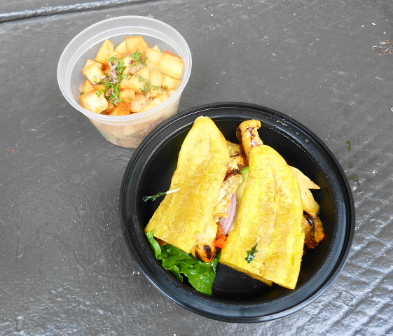 I’d ordered my meal online and it was ready in the 15 minutes it took for me to walk there. The sandwich smelled great when I cracked the lid of the plastic takeout container and I’m not sure what the thin pieces of grilled chicken breast were marinated in, but it was great. No dry white meat here. The sandwich also contained avocado slices, tomato, lettuce, roasted red pepper and red onion and a container of mojo sauce came alongside which I used for dipping. This greatly enhanced the fried plantain and other bits of the sandwich that were a bit bland on their own.