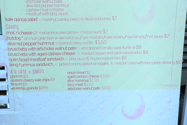 I was told the cart will be there every weekday, and from what I saw on the vast meu most everything is under the $10 mark (most things seemed to be in the $7 area), although it seems sort of wrong to pay more for a juice than an actual lunch. Never fear, I’ll be consuming the food from this cart in the near future and will file a full report. Someone needs to find out if gluten free macaroni with raw cashew cheese sauce tastes like!