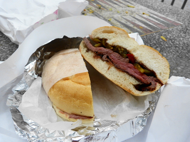 There’s a certain order to do things once you get to the deli counter. Pro tip: Turn around and pick your bread of choice from the case behind you (seen at the left in the above photo) and then hand that to one of the guys to make your sandwich. The roasted meats vary by price and bread choice but I got mine on a kaiser roll with hot peppers and their recommended balsamic truffle glaze for $6.80. If you want it on a hero it’s $2 more.