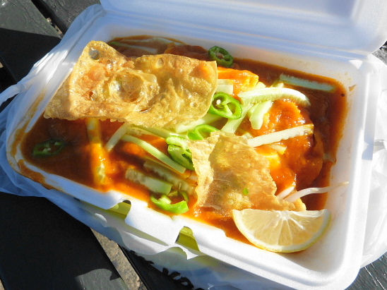 Above is my order of mee rebus ($5.95) which is a pile of thin egg noodles topped with a sweet and spicy sauce, jalapeno, bean sprouts, pieces of hard boiled egg and some fried tofu, capped off with a couple of pieces of fried tofu skin. They were out of my first choice which was the Indonesian standby rice dish nasi goreng, so I guess the key is to go earlier than 1 p.m. if you’re particular about what you want.