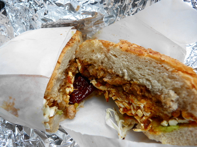 What I got was the size of a baby’s head, and full of stringy white cheese, bits of pork, some mashed up beans, avocado and…and an entire chipotle pepper in adobo. Thankfully I spotted the pepper when I pulled the sandwich apart for the photo and did not bite into the thing. I love spicy food, but that’s just a bit much.