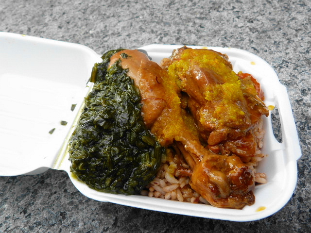 I nearly ordered the curry goat, but wasn’t in the mood for gamey meat, and instead went with the small size stew chicken ($5.50) with peas and rice and spinach, topped with some of the hot sauce that I went nuts over when I got a roti from this cart. Basically, whatever you’re asked as your meal’s being dished up, you should just say “Yes.”