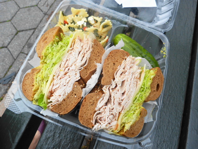 There are many sandwich options including some preset selections, smoked fish, a bunch of different salads and deli meats. I built my own with turkey, lettuce, swiss and deli mustard on a wheat everything bagel ($7.50). All of the sandwiches come with your choice of side salad and a whole dill pickle.