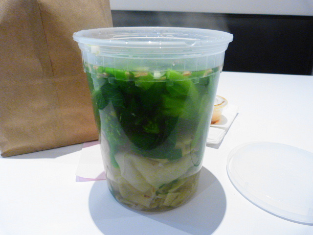 The Shanghai Wontons were decent for casual eaters, but wonton-connoisseurs are advised to pass. The soup’s solid, and there was also an ample amount of what appears to be the Chinese veg “choi sum” in the tub. All leaf, no stalks. Choi sum aficionados will know what I am talking about.