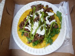 A picture of that first arepa (on the left) show a pile of beef atop an arepa that was smaller than the paper plate it sat on. It’s kind of hard to tell because it’s from a different angle, but the chicken one I had last week was quite a bit smaller, and I paid $9.80 for it because they add tax. Yes, there was a fair amount of chicken underneath the hogao and cheese, but it wasn’t all that filling for the amount of money I paid for it.