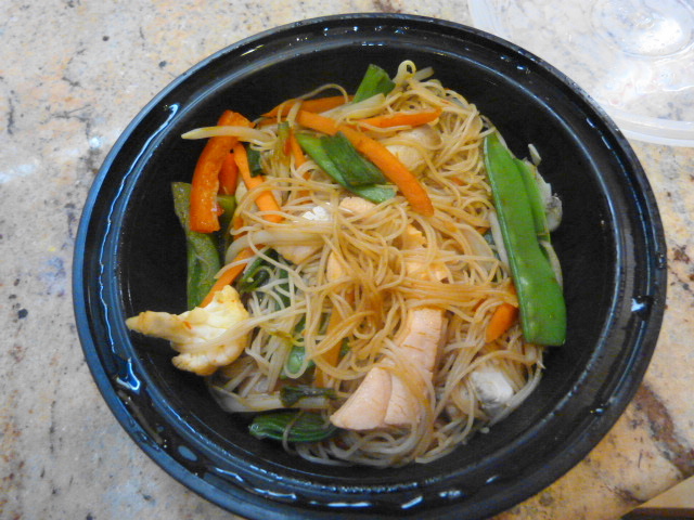 I put in some thin rice noodles, various vegetables including mushrooms, peppers, green onion, bean sprouts, carrots, along with a few shrimp and a piece of salmon. It was then cooked up in a couple of minutes on the large griddle, and then off to be weighed and paid for. I was pretty confident that I hadn’t gone overboard but my total was still $10.25. As you can see this equated to about a half container full of food which filled me up but wasn’t nearly as much as you’d get from any of the Chinese or Thai places nearby for the same amount of money or less.