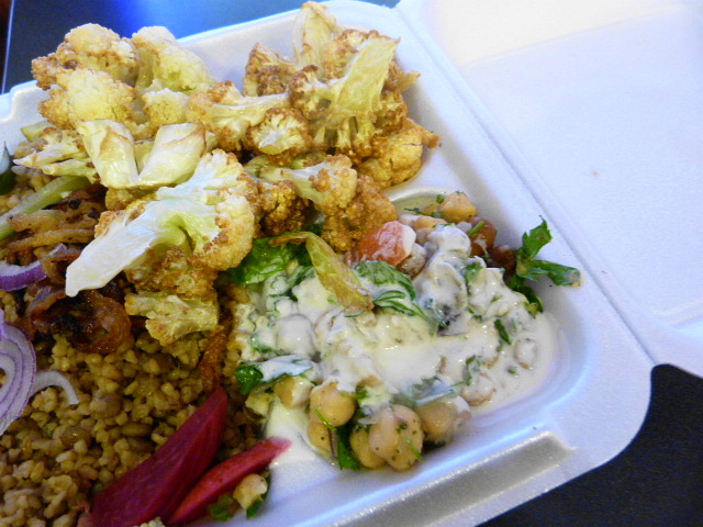 The cauliflower for my platter ($10) was fried to order. I wish they would have let more oil drain off before putting the vegetable in the takeout container because it was fairly oily, but was a good change of pace from falafel. I would recommend either grabbing extra tahini or hot sauce or some salt to sprinkle on the cauliflower as there was no seasoning to be had here. If you like cauliflower, you’ll probably like this, but if not even frying probably won’t change your mind.