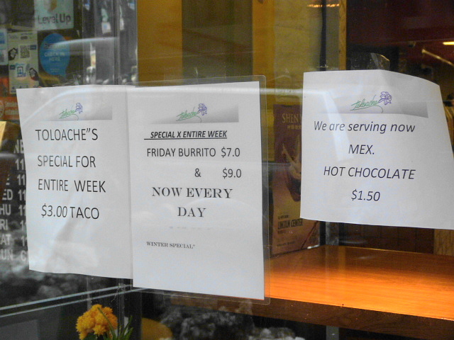It looks like Toloache is trying to bump up business by offering some deals on tacos and burritos that are ongoing. Every time I’ve walked by recently, it seems there has been a signboard out front advertising three mix and match tacos for $9, which is a decrease from $12. Another sign in the window shows that you can get a burrito for $9 and $7 on Fridays (if I’m reading that correctly). These prices are pretty on par for the area, but after some of their dishes jumped the $10 mark, it’s nice to see some back within our lunching price range.